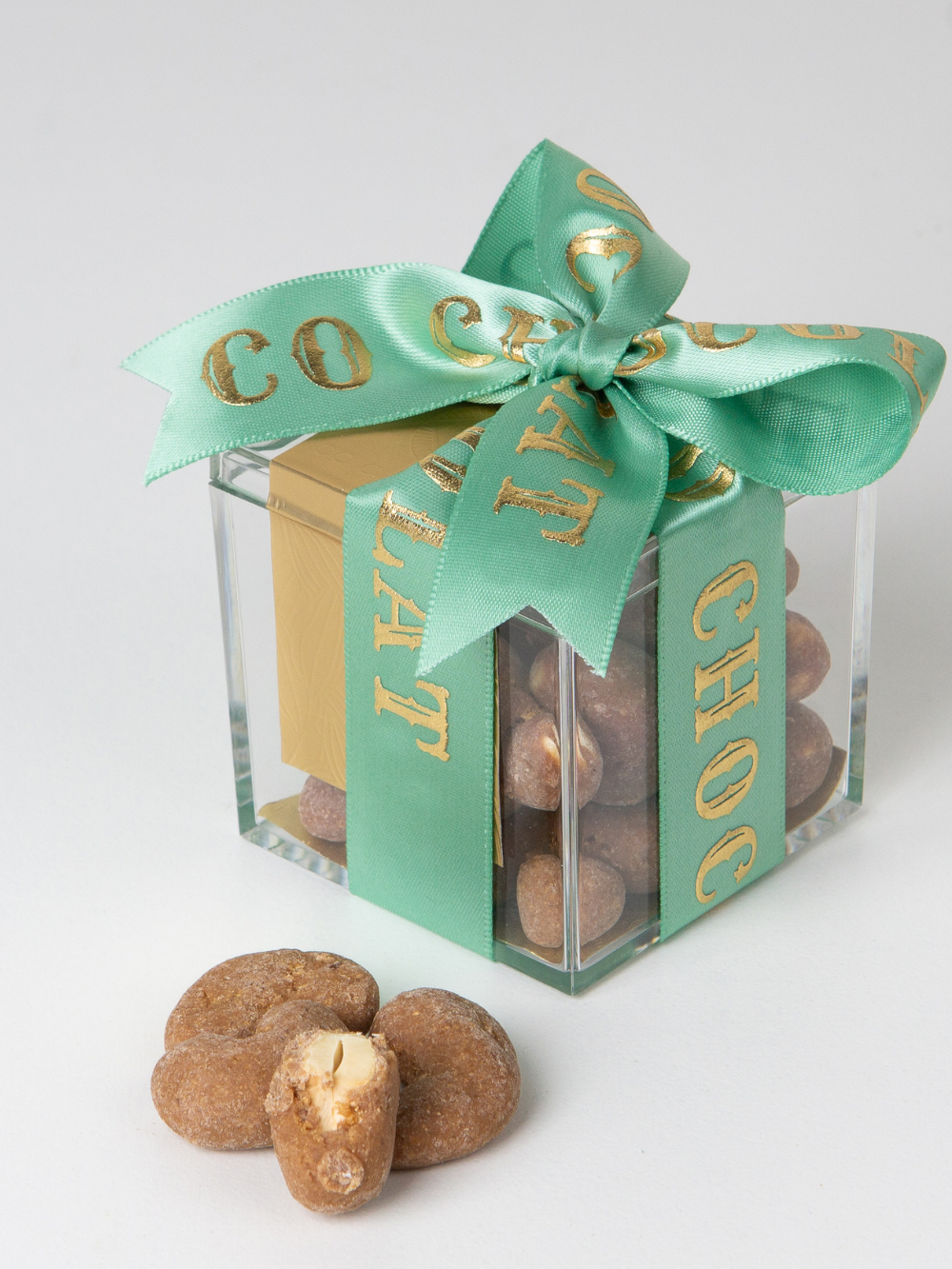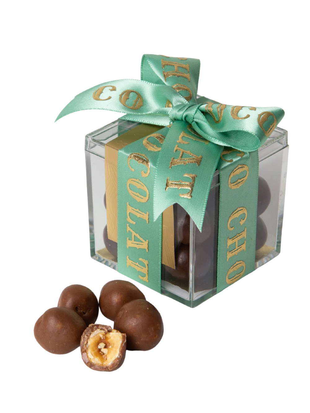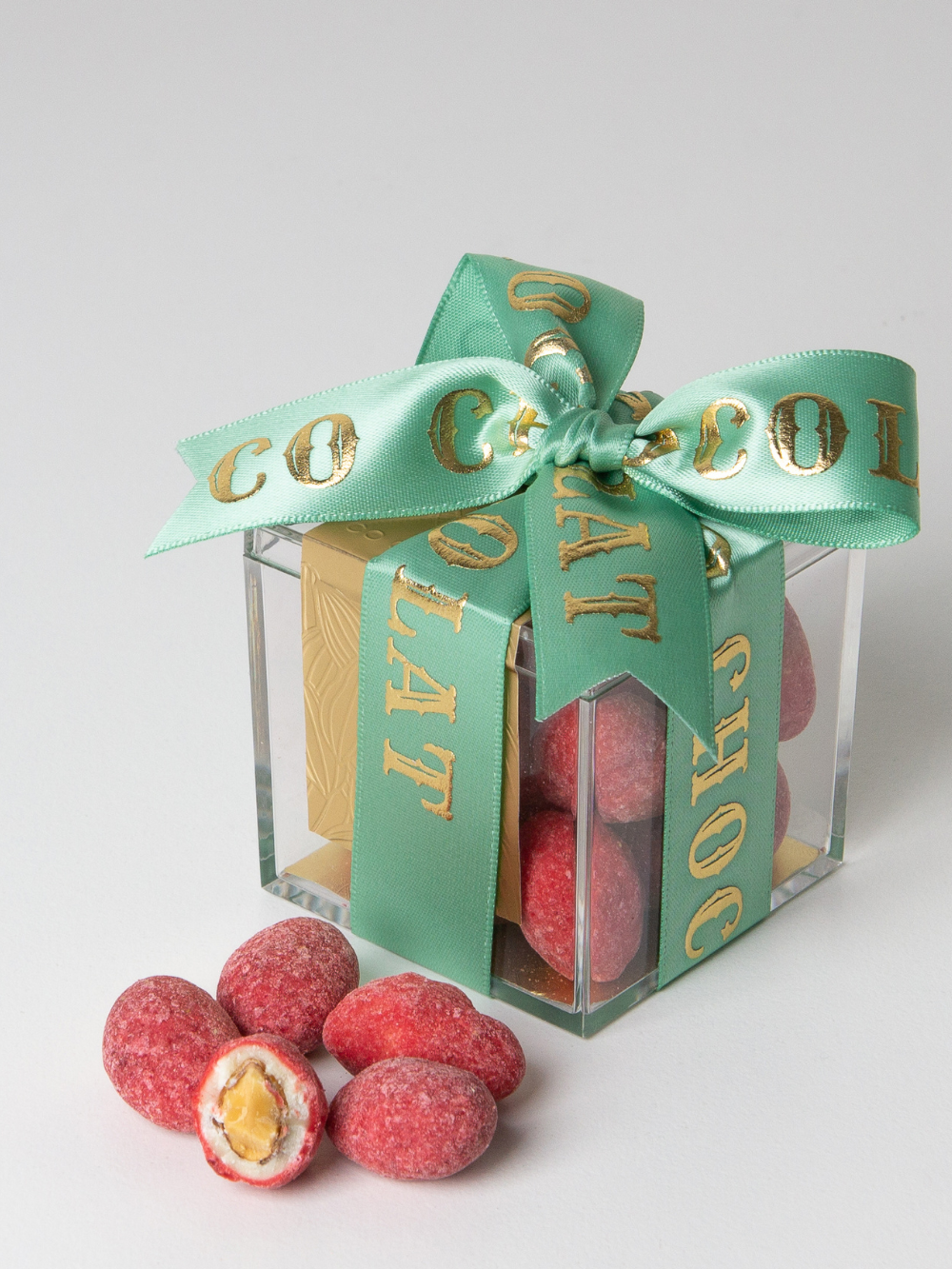 Our elegant, sleek 5x5 cm acrylic keepsake perfectly showcases bite-sized chocolate-coated nuts that sparkle as beautifully as they taste.