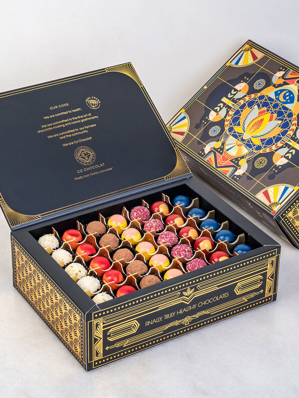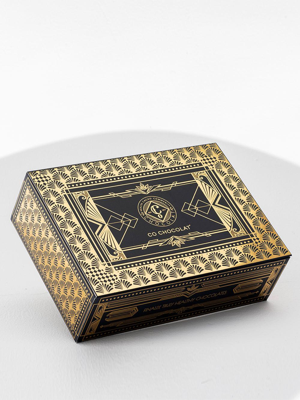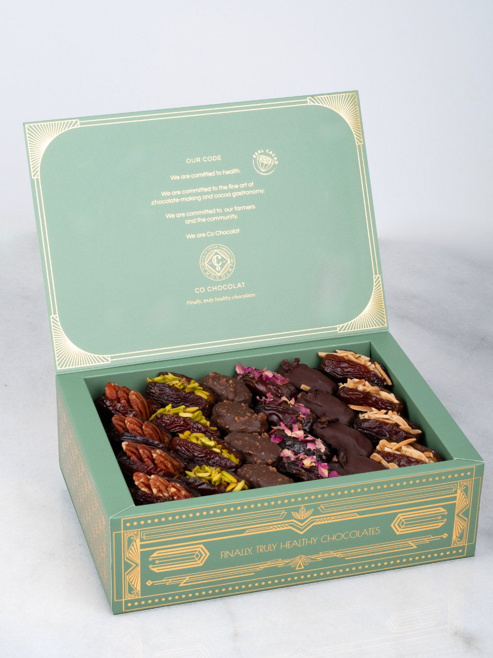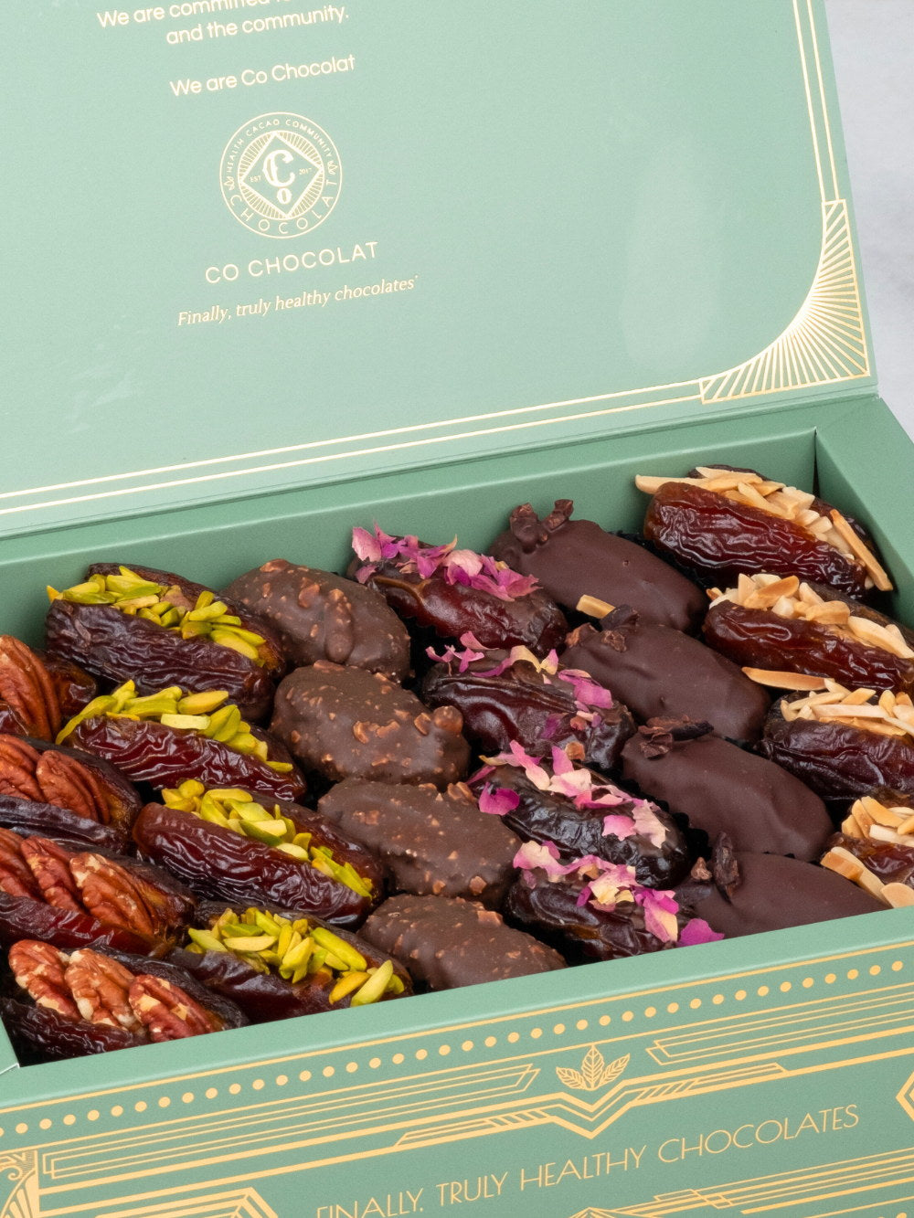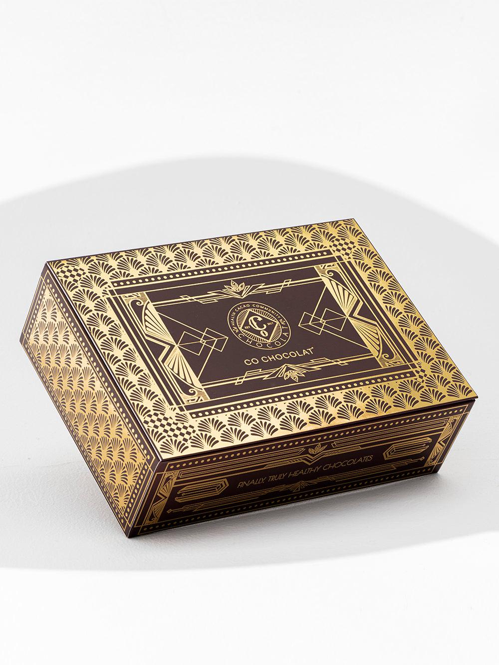 Our Noor Art deco box is filled  with vegan, cane sugar and gluten-free treats using only all-natural ingredients. Enjoy the awesome sweetness of  premium, jumbo medojoul dates. Indulge in Enrobed Chocolates, fruity Pâte de Fruit, Assorted Mendiants, fine Chocolate Pieces, or Indulgent Cookie Truffles.