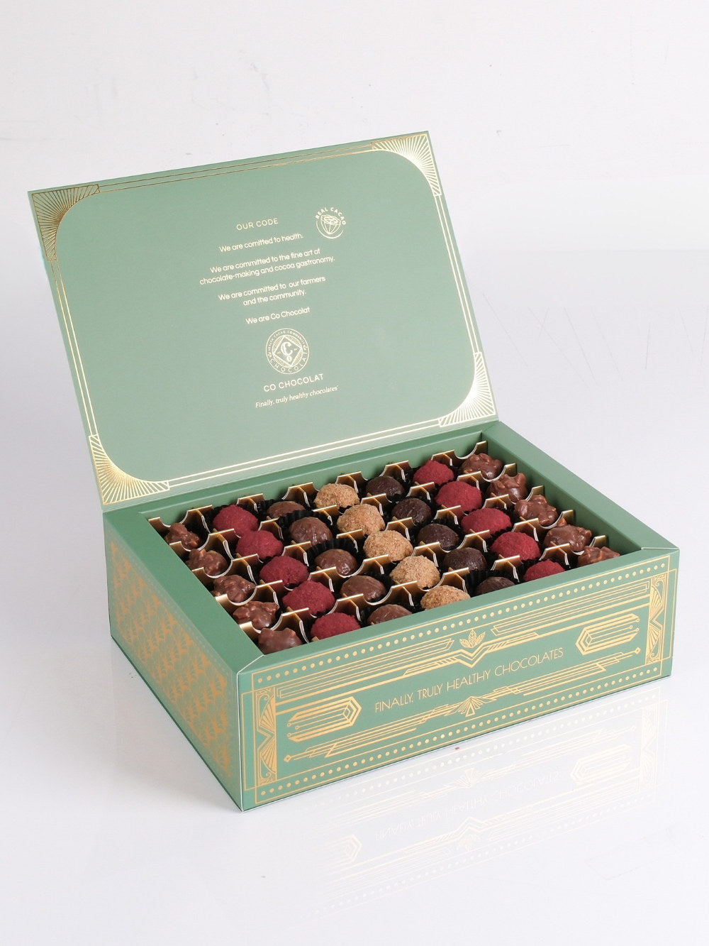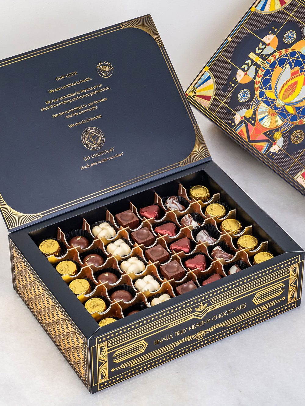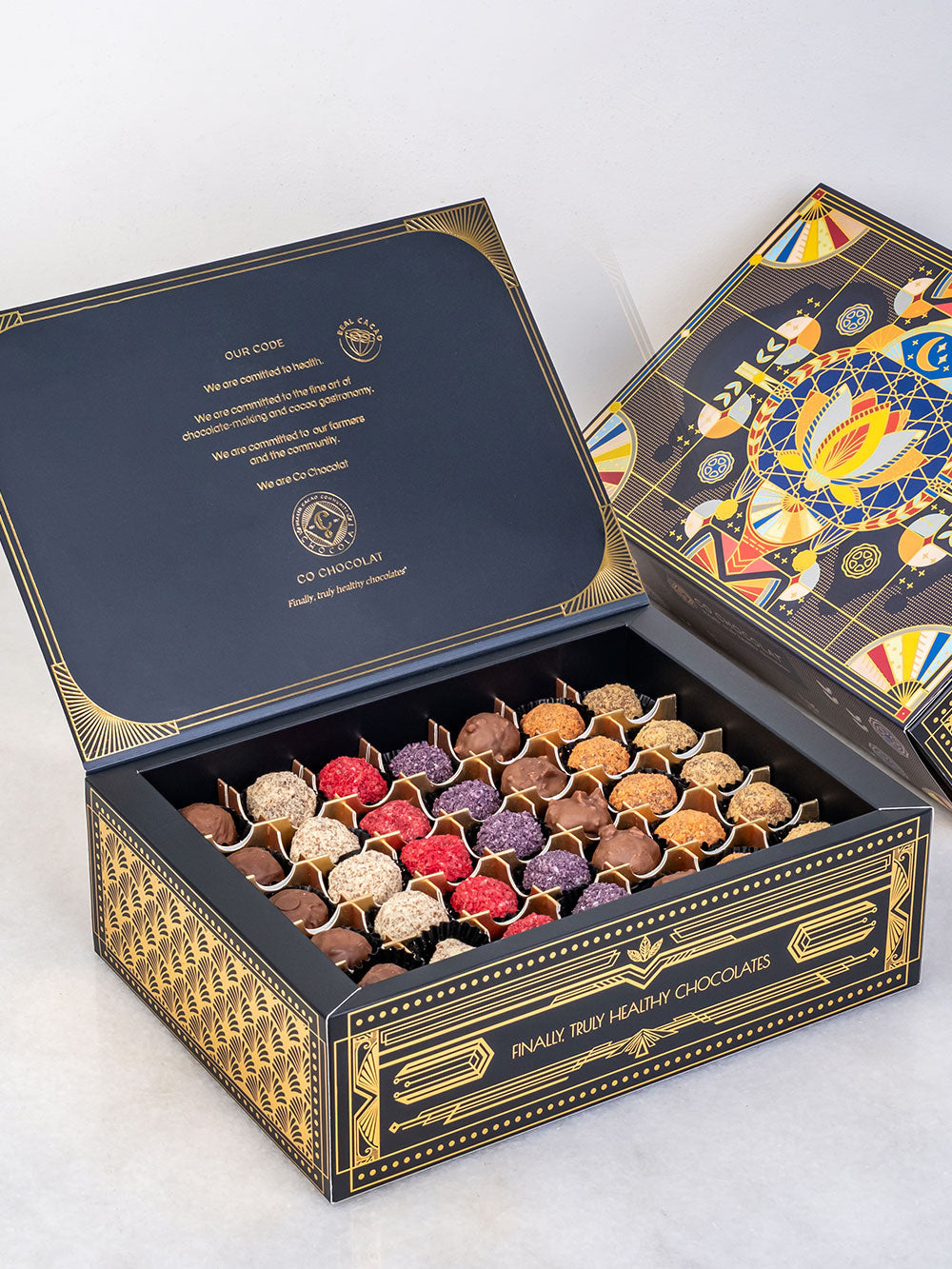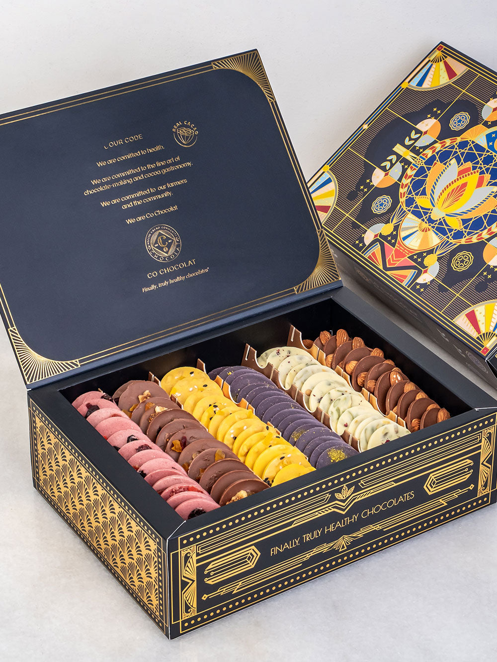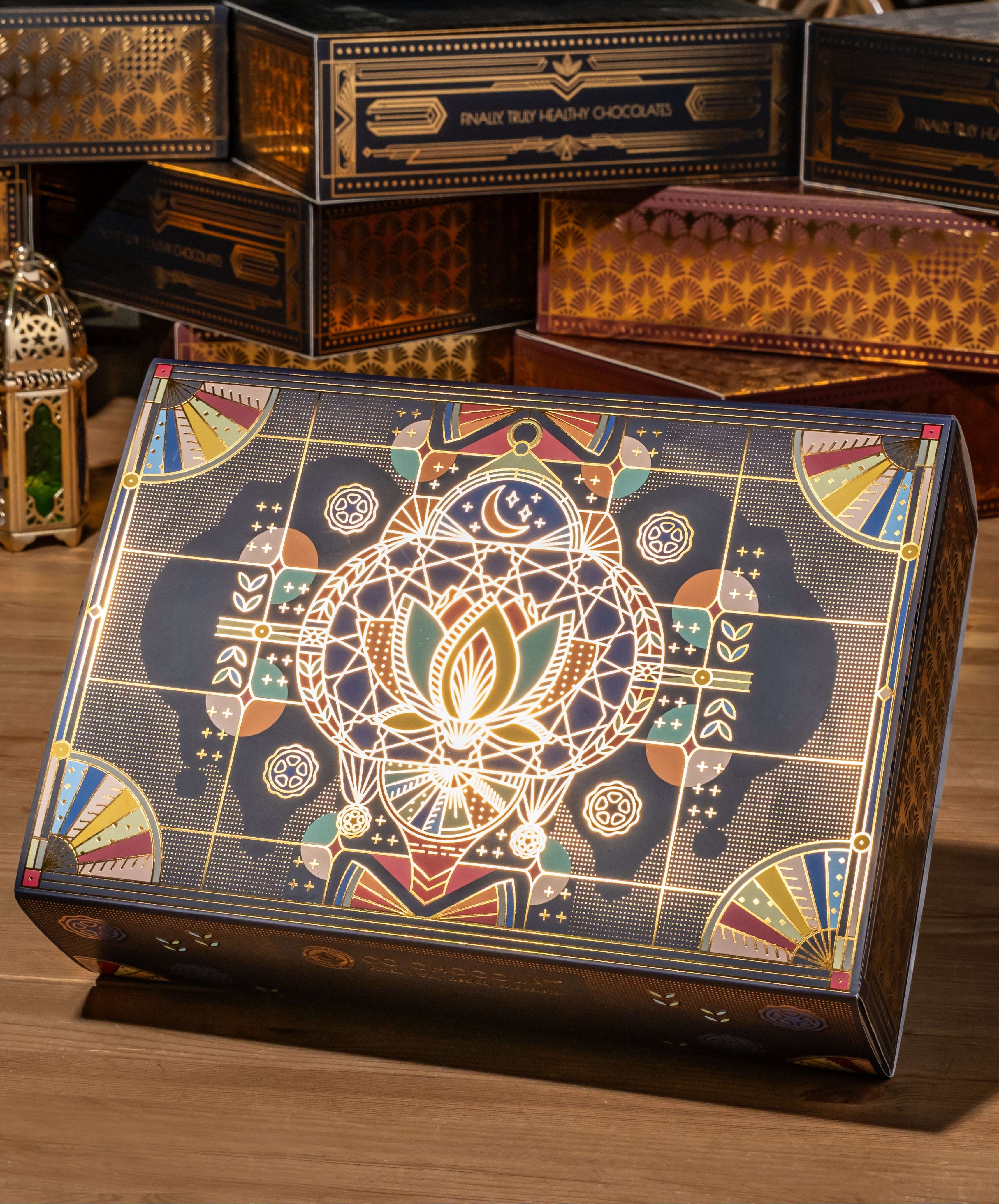 Our Noor Art deco box is filled  with vegan, cane sugar and gluten-free treats using only all-natural ingredients. Enjoy the awesome sweetness of  premium, jumbo medojoul dates. Indulge in Enrobed Chocolates, fruity Pâte de Fruit, Assorted Mendiants, fine Chocolate Pieces, or Indulgent Cookie Truffles.