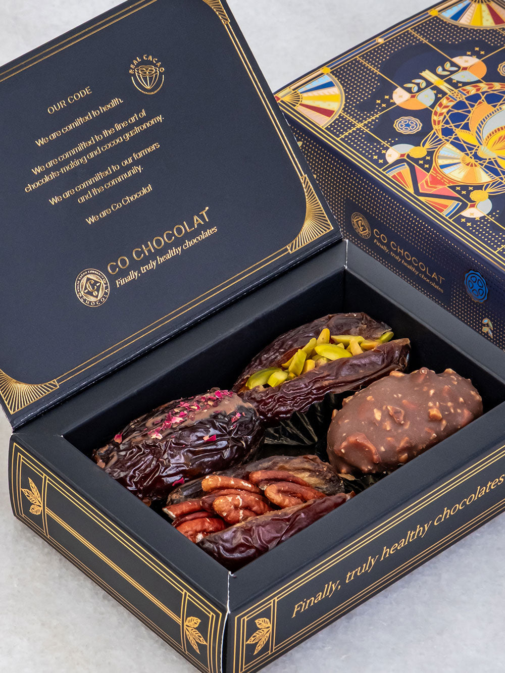 Our Noor Mini Art Deco (MAD) box is both elegant and practical for one or two persons to enjoy. Choose from premium medjoul dates, juicy khalas dates or chocolate assortments. Then get them covered with single origin chocolates, or stuffed with the most flavorful ingredients: