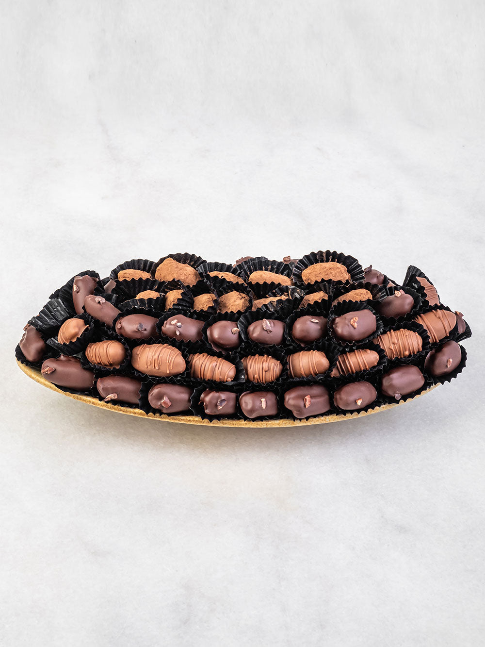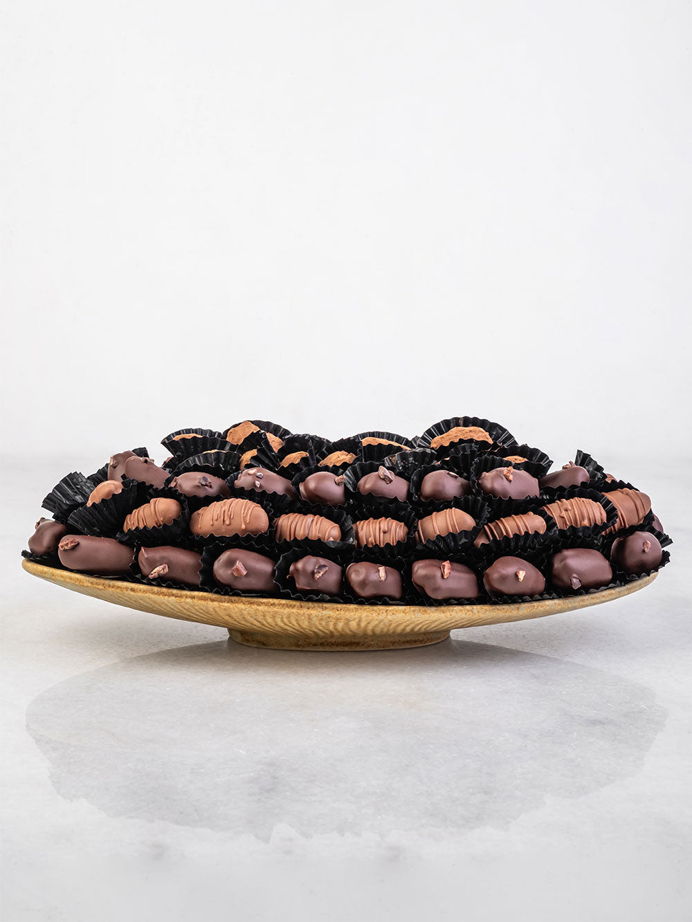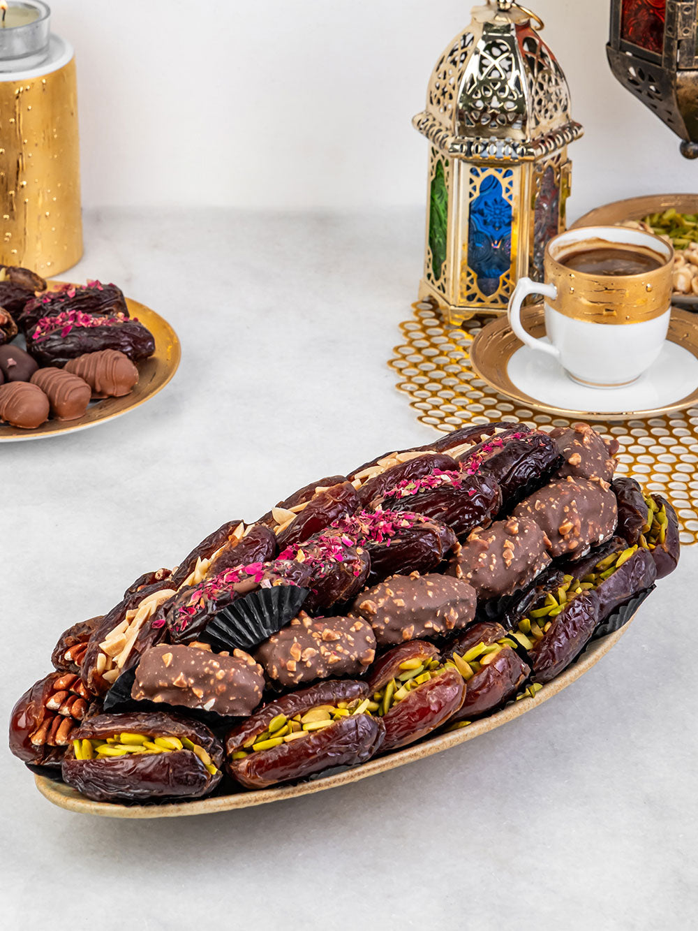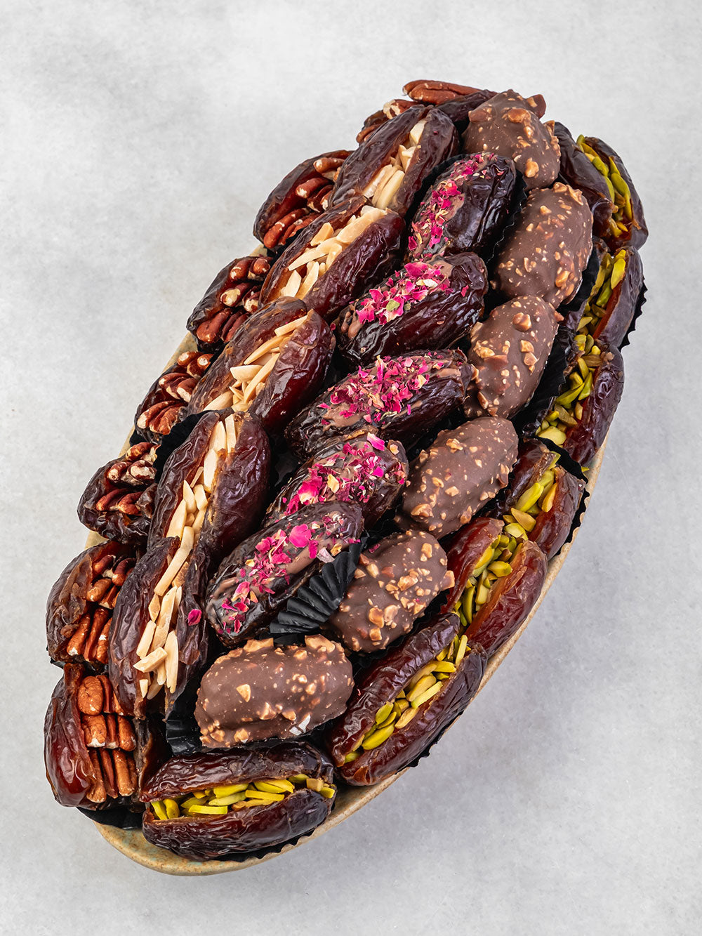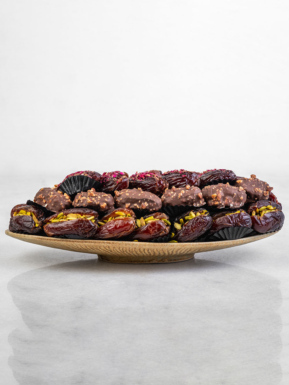 An earthy ceramic tray holding juicy khalas dates and plump medjoul dates. Our Emirati grown khalas dates are covered with single-origin chocolates, while our plump medjoul dates are from Palestine, stuffed with the most flavorful ingredients with dipped single-origin chocolates.