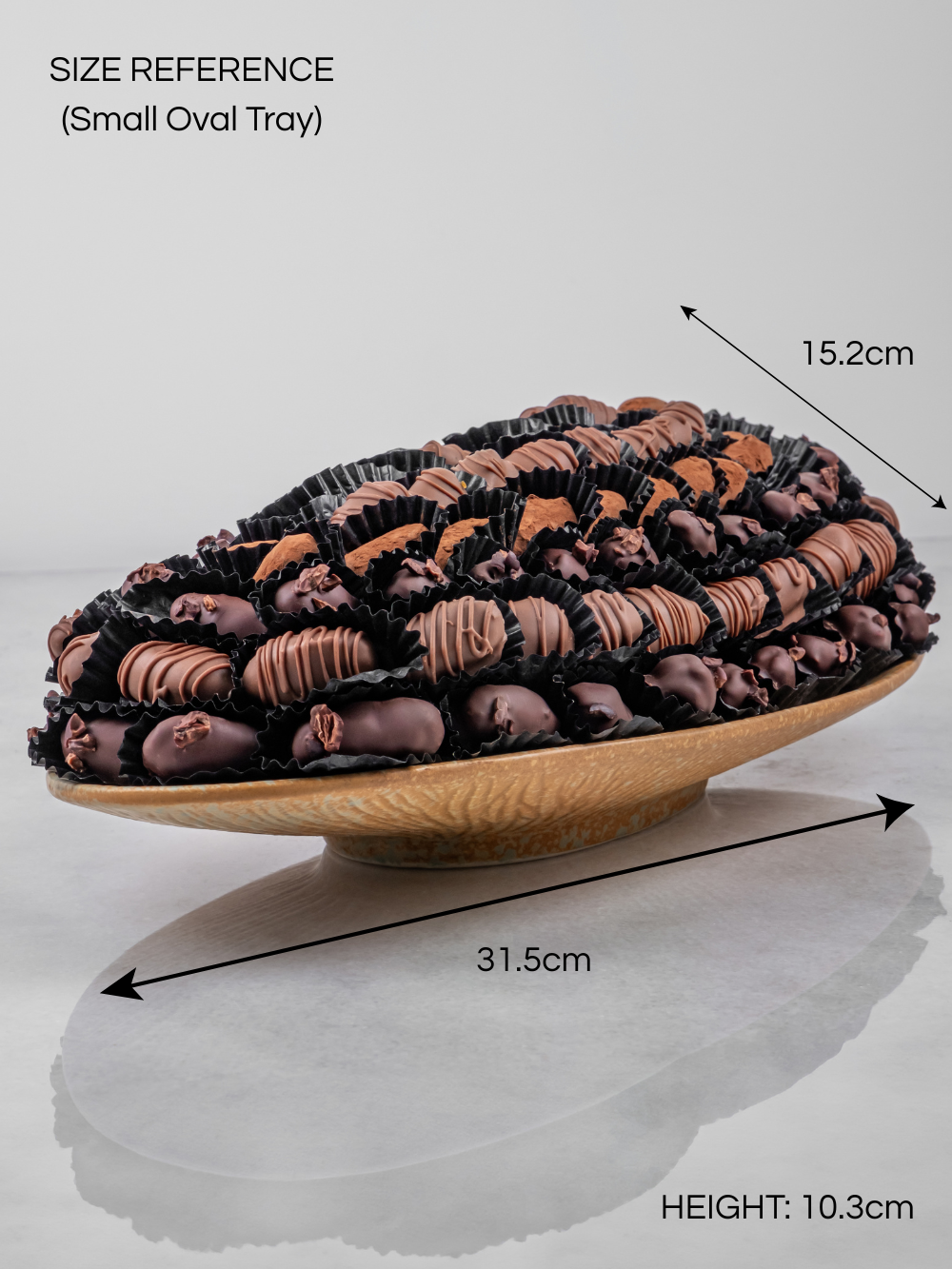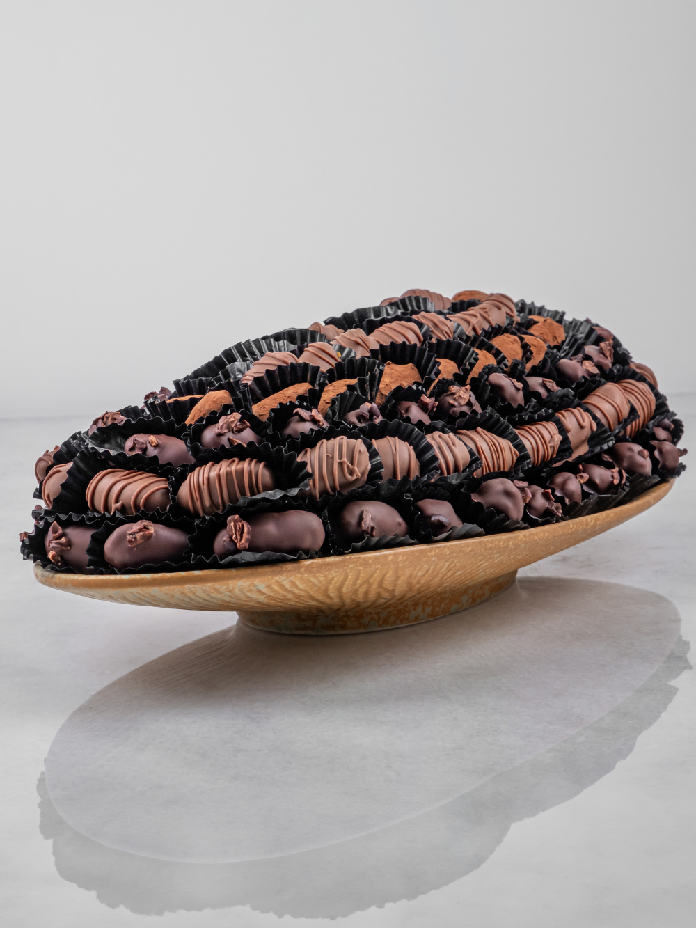 An earthy ceramic tray holding juicy khalas dates and high quality dried fruits. Our Emirati grown khalas dates are covered with single-origin chocolates, while our dried fruits are stuffed with the most flavorful ingredients.
