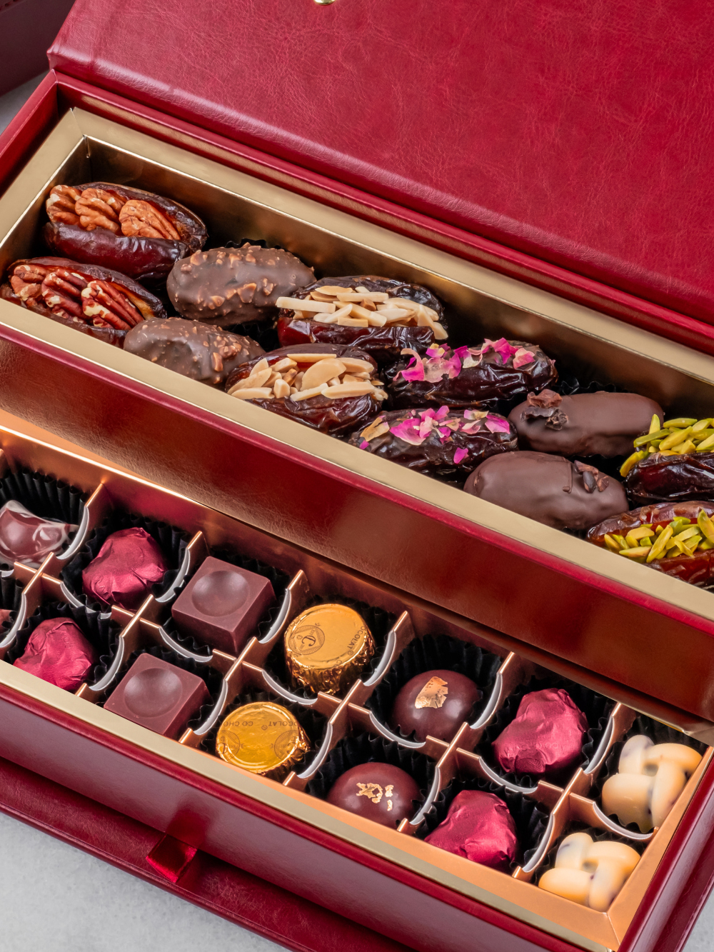 Our chicest sustainable gift box to date. Choose the color of your faux leather luggage box and decide its delicious contents. Indulge without guilt on single-origin chocolates (from whole cacao beans!) and all-natural ingredients paired with either juicy khalas dates or premium medjoul dates, or choose our high quality stuffed dried fruits for a balance of texture and flavors to this trove.
